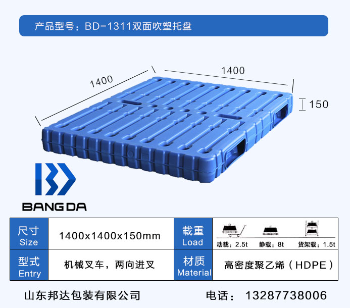 BD-1414雙面塑料托盤尺寸為1400*1400*150(mm),采用國內最先進的吹塑技術,原材料采用的是HDPE一種結晶度高,非極性的熱塑性樹脂;邦達的雙面塑料托盤承載強,耐高溫且環(huán)保;山東邦達包裝有限公司承諾旗下所有的產品均此采用全新材料,廠家直銷,正規(guī)發(fā)票,量大優(yōu)惠!