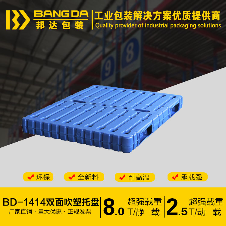BD-1414雙面塑料托盤尺寸為1400*1400*150(mm)采用國內最先進的吹塑技術,原材料采用的是HDPE一種結晶度高,非極性的熱塑性樹脂;邦達的雙面塑料托盤承載強,耐高溫且環(huán)保;山東邦達包裝有