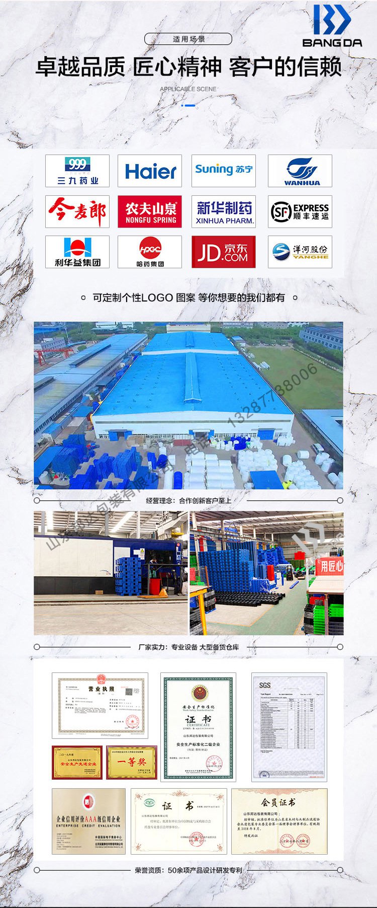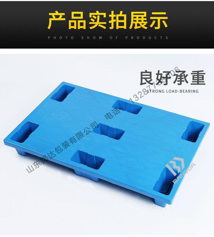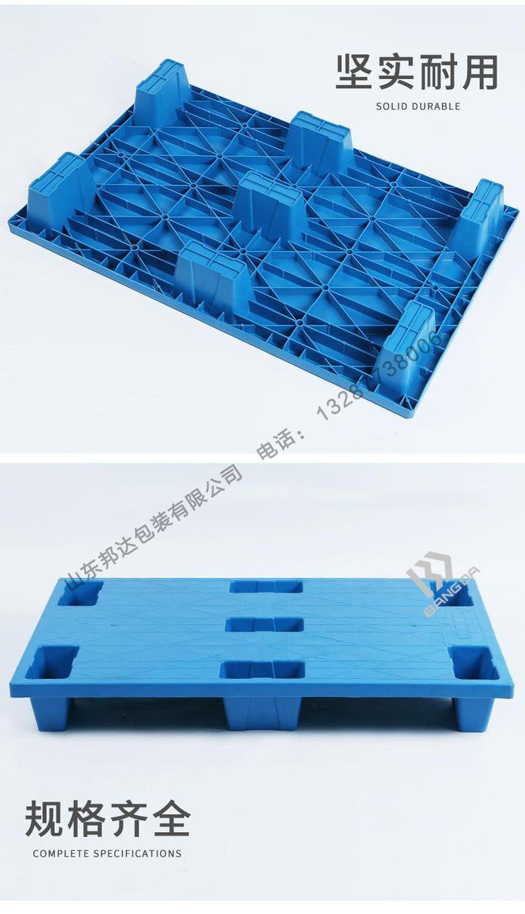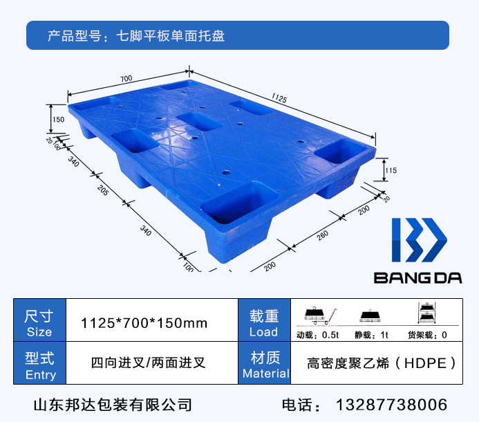 七腳塑料托盤屬于輕型的塑料托盤,適用于倉板防潮使用,輕型貨物的周轉(zhuǎn);山東邦達包裝有限公司七腳塑料托盤根據(jù)輕巧的設計實現(xiàn)了超輕化及一體化的托盤生產(chǎn)。在抗沖擊力與耐用性方面,邦達塑料托盤有著同行業(yè)無可比擬的優(yōu)越性。邦達七腳托盤經(jīng)過把受熱融化的材料(HDPE)由高壓射入模腔,經(jīng)冷卻固化后,得到成形品,具有卓越的耐水性、耐繡性及耐久性可以長時間使用,經(jīng)濟實惠。